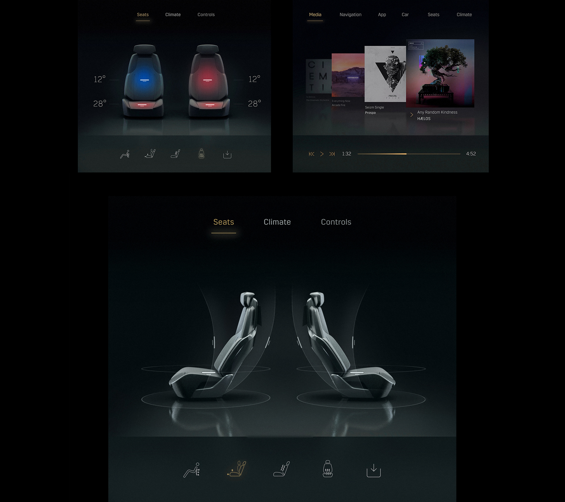Building on my earlier work for Land Rover and CloudMade, this project explored a more expressive and less conventional approach to in-car UI. We focused on how refined 3D design and motion could connect function with emotion, enhancing the driving experience without overwhelming it. The work was primarily conceptual, helping to define a more elevated and future-facing interface language through a wraparound display, personalised UI moments, and carefully choreographed transitions.