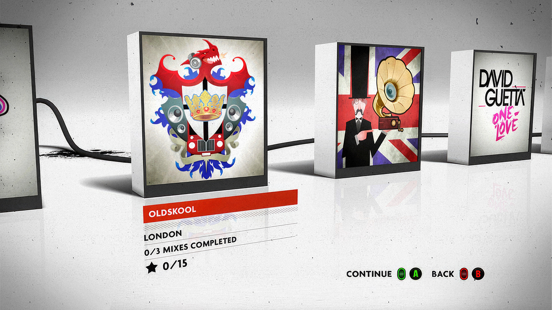 I was responsible for overseeing the Front End, UI, and in-game HUD, and on a music action rhythm game that represents a large proportion of the overall project. The original UI leaned heavily on the wild energy of DJ culture. It looked great, but with the in-game experience already a bonkers DJ mash-up rave, it risked overwhelming the player. For the sequel I pushed for contrast: a cleaner, more sophisticated front end that set the tone without competing with gameplay intensity. Menus should not only be functional but also establish mood and identity.