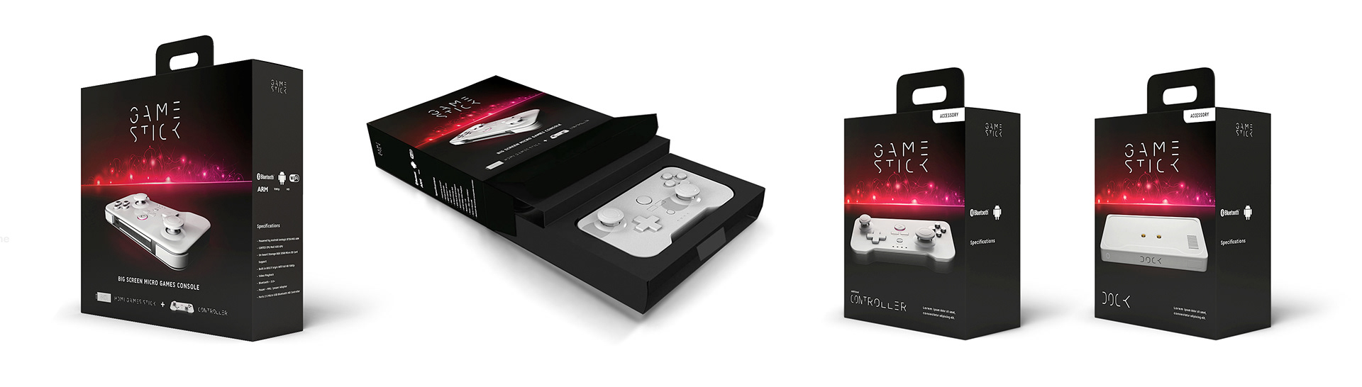 The branding and packaging I developed for the console and its accessories were designed to stand out on busy retail shelves while maintaining a clean, premium feel. The console was later launched on Kickstarter in January 2013 under the name GameStick, raising over US$650,000 in its campaign, more than six times its original target.