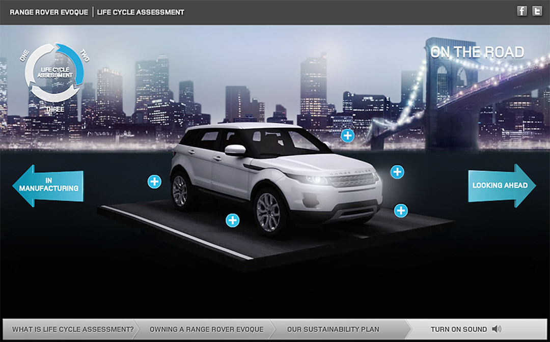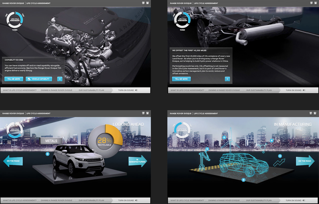 I produced an award-winning 3D animation and interactive website detailing how the Evoque supports sustainability at every stage of its life. I managed and produced all aspects of the project’s development, from converting the vehicle data and generating 3D assets and animations to designing the UI and crafting bespoke audio effects.