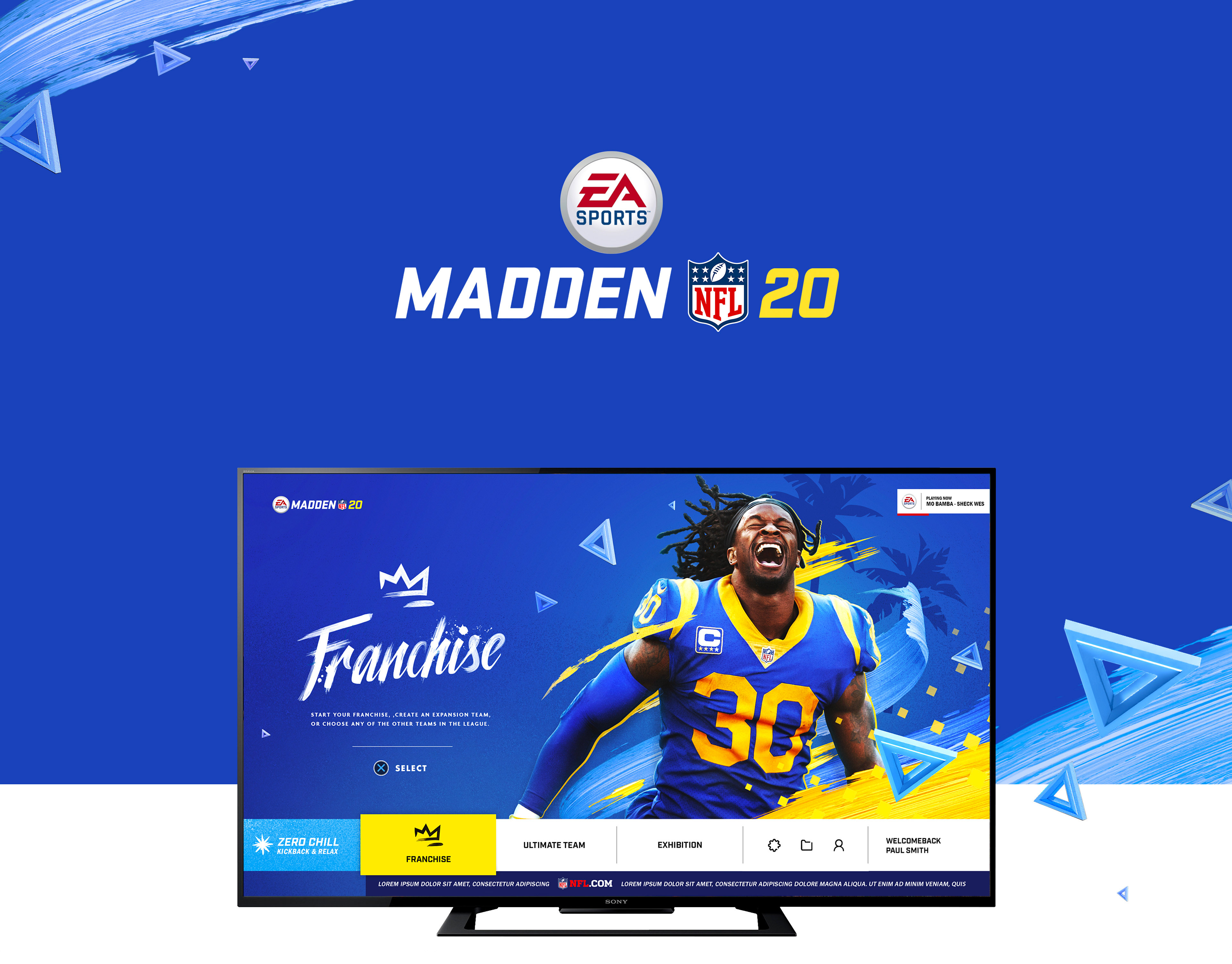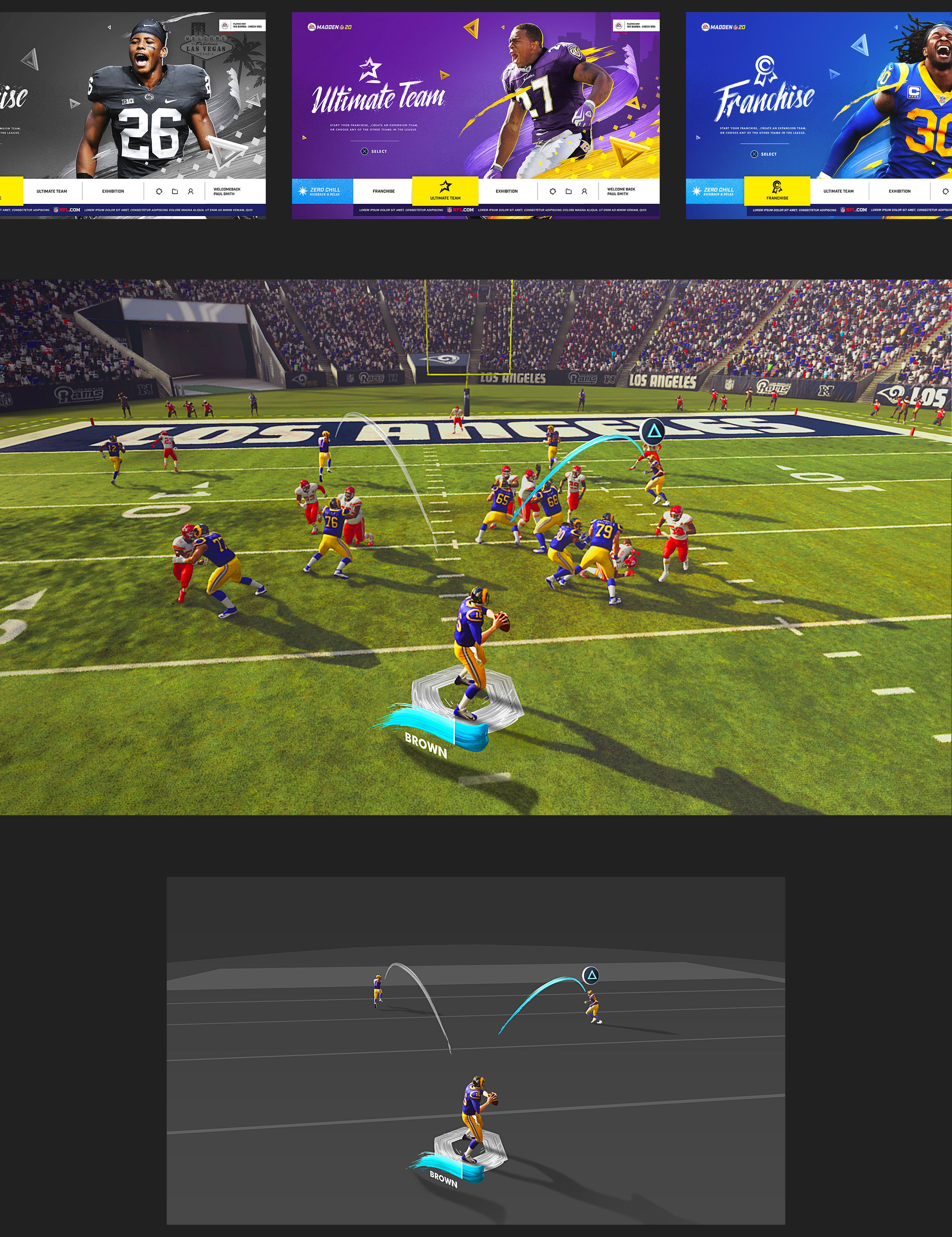 I worked with Territory Studio's multi-disciplined team headed up my Marti Romances to create a compelling UI upgrade for Madden 20. With each annual release, EA's is looking to freshen up the presentation and further develop new areas of the game. You want it to be abundantly clear to the player: this new version of the game. We jumped on the UI, HUD, and Front End art direction, adding the distinct 3D brush motifs, 3D shapes, vibrate colour palette, and handwritten headings. For each team, we developed individual themes to reflect the player's personal team preference.