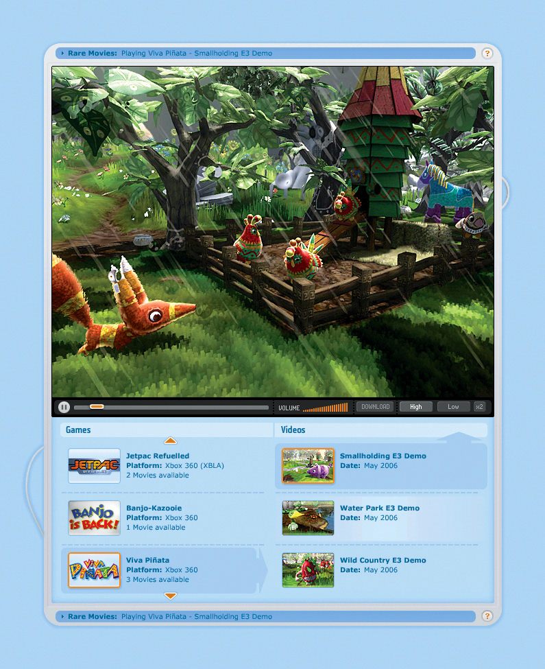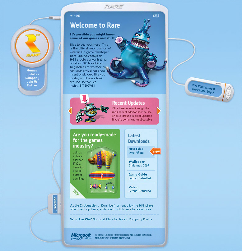 While working for the prestigious games developer Rare, I was briefed to work alongside Leigh Loveday (studio veteran) to redesign their website. The existing site, although visually dated, was well managed with solid community interaction and regular updates . The new design was built upon established ideas but added more creative flair. It better reflected the studio’s creativity and humour, as well as making better use of emerging technologies.