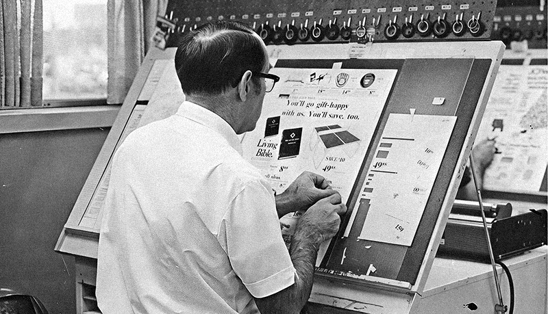 Long before InDesign or Photoshop, publishing was done entirely by hand. Designers sat at large angled desks with scalpels, rulers, Letraset sheets and pots of glue.
